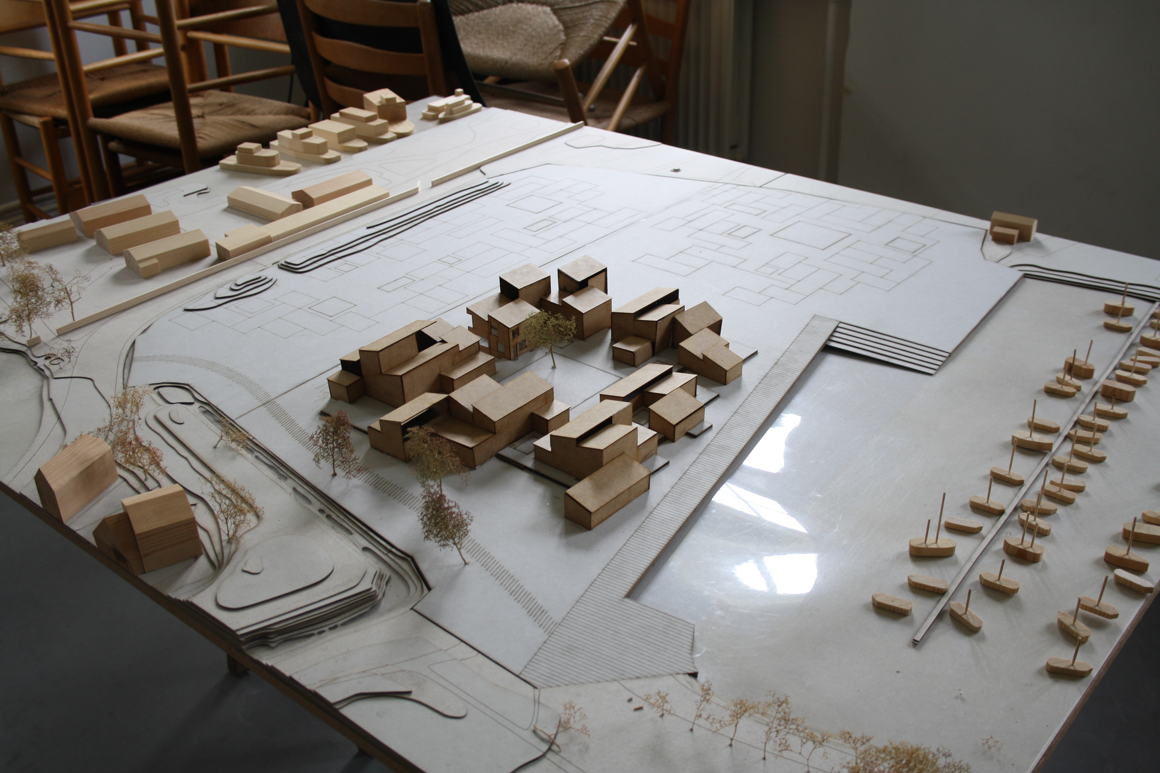 The project designs a new housing area on an empty plot at Refshaleøen, Copenhagen. The housing is organized in three clusters, where every collective of housing has a shared garden, which is elevated to give privacy. These elevations are visible within some of the houses, creating a variety of spaces. The waterfront is transformed into a public pier which gives the city an access point to the water.